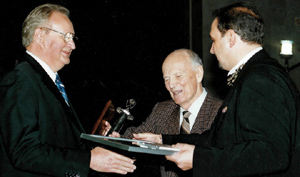 | Академик Борис Патон и певец Владимир Гришко вручают Николаю Сивому Золотую стелу Международного академического рейтинга «Золотая Фортуна», учрежденного Кабинетом министров Украины и Национальной академией наук |