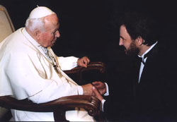 Через какое-то время пою в Ватикане. А потом попадаю на аудиенцию к Папе Римскому Павлу Иоанну II. Обращаюсь к нему: "Виконуючи прохання моїх друзiв, я хочу вiд себе та вiд їх iменi запросити вас до Києва". Прикасаюсь к его руке - она теплая, приятная. И он мне отвечает на чистом украинском: "Погоджуюсь. Буду. Дякую". Все было, как во сне, как в кино.