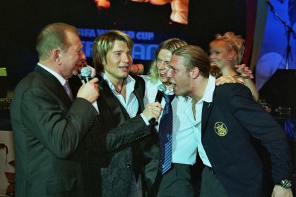 | Григорий Суркис и Леонид Кравчук мысленно уже в Германии | Сбросив с плеч тяжкий груз президентства, Леонид Кучма стал позволять себе простые человеческие радости. В квартете с Николаем Басковым, Анатолием Тимощуком и Андреем Ворониным Леонид Данилович спел, а в дуэте с Таисией Повалий еще и станцевал |