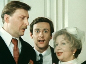 | Виктор Борцов (Савва Игнатьевич), Олег Меньшиков (Костик) и Инна Ульянова (Маргарита Павловна) в лирической комедии «Покровские ворота», 1982 год |
