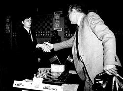 ![]() «Во время матча Корчной очень часто вел себя некорректно, выдвигал необоснованные обвинения, строил гримасы... Потом эту привычку перенял и Каспаров» |