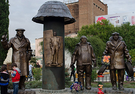 | Георгий Данелия и герои «Мимино» в монументальном исполнении Зураба Церетели в Тбилиси. «Мне трудно судить, похож я или нет, но сам себе очень понравился» Фото «РИА Новости» |