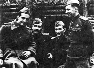 | У Копелева было право на бронь, но он пошел на фронт добровольцем. Юрий Маслов, Лев Копелев, Яков Драбкин и Лев Дубровицкий в Добываловском лесу на Валдае, 1943 год |