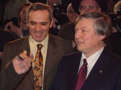 — Вы знаете (пауза)... да, он любитель шахмат. Раньше я был против него категорически, а сейчас наши отношения несколько улучшились, вернее, значительно улучшились, когда я отказался бороться за пост президента ФИДЕ. Думаю, я представлял для Илюмжинова серьезную угрозу, поскольку многие события (в том числе и мой матч с Каспаровым) мир оценивает иначе. Словом, когда я отказался составить ему конкуренцию, он понял, что со мной выгоднее дружить, чем враждовать. Объединив усилия, мы можем много успеть, особенно в России.