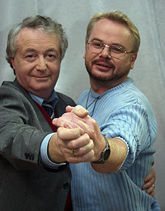 - Откуда взялось утверждение, будто в жизни профессиональные юмористы - люди мрачные, чуть ли не со склонностью к постоянной депрессии и ипохондрии? Наверное, внеэфирное, так сказать, общение буднями для них тоже не назовешь, но тяга к импровизации, шалопайству обнаруживалась у всех - от Петросяна до Задорнова. Лион Измайлов после съемок программы стал обучать меня танго, дудя в воображаемые трубы. Прощаясь, он расцеловался со всеми девчонками, а затем, внезапно сложив губы бантиком, потянулся ко мне. Оторопев, я проделал то же самое. "Нет, нет, - вдруг закричал Измайлов, - я не пойду на это! Я еще остаюсь в сексуальном меньшинстве!!!". И с криком: "Я все еще люблю женщин!", страшно довольный собой, он запрыгал вниз по ступенькам, словно мальчишка.