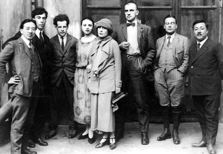 | Встреча с японским писателем и журналистом Тамидзи Наито (крайний слева). За ним: Борис Пастернак, Сергей Эйзенштейн, жена поэта-футуриста Сергея Третьякова Ольга, Лиля Брик, Владимир Маяковский, советский дипломат Арсений Вознесенский и переводчик Наито. Москва, 1924 год |