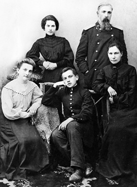 | Семья Маяковских. Мать Александра Алексеевна, старшая дочь Людмила (стоит), отец Владимир Константинович, младшая дочь Ольга, в центре — Володя, ученик 3-го класса Кутаисской гимназии, 1905 год Фото «РИА Новости |