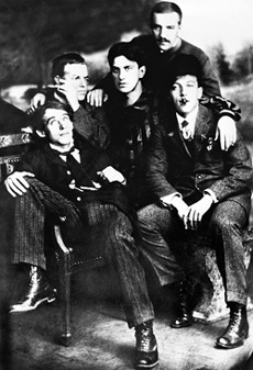 | Владимир Маяковский (третий слева) в кругу друзей-футуристов: Алексея Крученых, Давида Бурлюка, Николая Бурлюка и Бенедикта Лившица, Москва, 1911-1913 годы Фото «РИА Новости» |