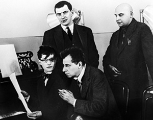 | Дмитрий Шостакович, Владимир Маяковский, Александр Родченко и Всеволод Мейерхольд во время работы над спектаклем «Клоп», 1929 год Фото «РИА Новости» |