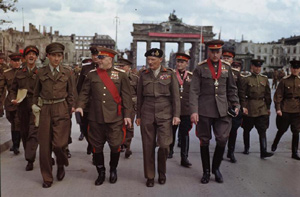 | Георгий Жуков (второй слева), справа от него британский фельдмаршал Бернард Монтгомери и маршал Константин Рокоссовский у Бранденбургских ворот в Берлине. 12 июля 1945 года Монтгомери возложил на Жукова большой Крест Почтеннейшего ордена Бани 1-го рыцарского класса |
