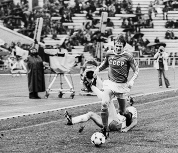 | С мячом игрок сборной СССР Владимир Бессонов, начало 80-х. «Игра есть игра, и от тебя зависит, каков будет результат после финального свистка. Необходимо от игры к игре доказывать не то, сколь ко ты стоишь, а каков твой дух». Фото "ИТАР-ТАСС" |