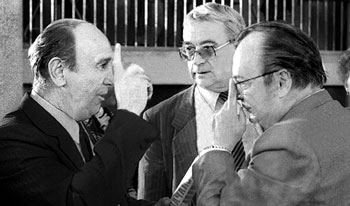 | Писатель Юрий Черниченко, главный редактор газеты «Московские новости» Егор Яковлев и Николай Шмелев на 19-й Всесоюзной конференции КПСС. Москва, 1988 год |