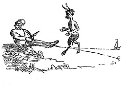 ![]() "Балдушка, погоди ты морщить море, оброк сполна ты получишь вскоре...". Балда и бесенок. Рисунок А. С. Пушкина |