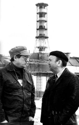 ![]() Юрий Щербак и российский публицист Юрий Черниченко в Чернобыле. 1989 год |