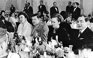 | Галина с третьим мужем Юрием Чурбановым и ее брат Юрий Брежнев (до 1986 года — замминистра внешней торговли СССР) с супругой Людмилой на одном из кремлевских банкетов |