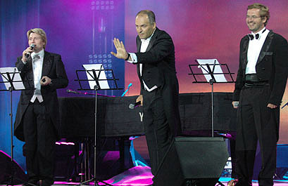 ![]() Самые громкие овации сорвал номер «Три тенора по-украински». В роли Доминго, Каррераса и Паваротти выступили Николай Басков, Александр Пономарев и Виктор Пинчук |