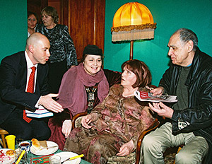 ![]() Ноябрь 2007 года, Москва, последний день рождения Нонны Викторовны. Дмитрий Гордон, Раиса Недашковская, Нонна Мордюкова и режиссер Александр Аскольдов. В дверях — сестры именинницы Наталья и Татьяна Фото Александра ЛАЗАРЕНКО |