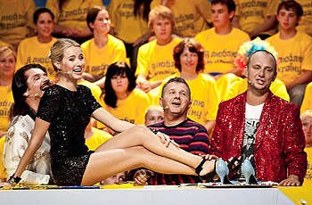 | Участники шоу: Павло Зибров, ведущий Юрий Горбунов, Потап и певица Арктика, она же Ольга Горбачева: «Думала, я здесь для красоты, а не для ответов...» |