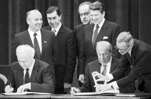 | Министр иностранных дел СССР Эдуард Шеварднадзе, госсекретарь США Джордж Шульц, Генеральный секретарь ЦК КПСС Михаил Горбачев, президент США Рональд Рейган и другие во время заключения договора о сотрудничестве между СССР и США в сфере науки, образования и культуры, 1985 год |