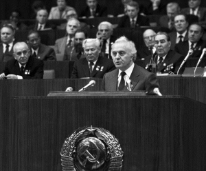 | Эдуард Шеварднадзе выступает с докладом на XXVI съезде КПСС, за ним в первом ряду Виктор Гришин, Константин Черненко и Леонид Брежнев, 1981 год |