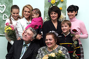 ![]() Сестры Сумские пришли поздравить родителей со своими детьми. Наталья - с дочерью Дашей и сыном Славиком, а Ольга - со старшей дочерью Антониной и младшей Аней |