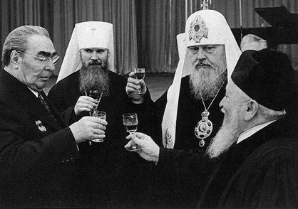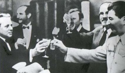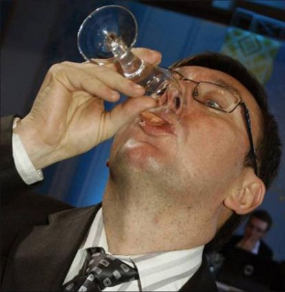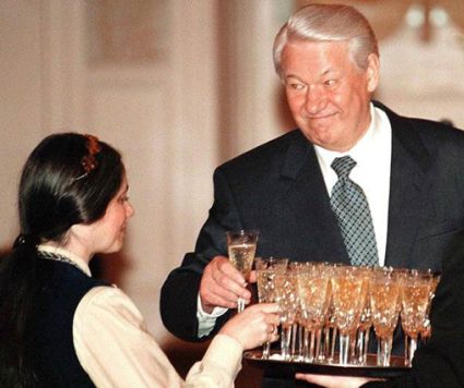 ![]() Для борьбы с пьянством советская пропаганда пользовалась всеми доступными методами, в том числе и «шершавым языком плаката» ![]() Премьер-министр России Владимир Путин. Истинный патриот, характер нордический, отличный семьянин, отличный спортсмен. В связях, порочащих его, замечен не был. Не курит, не пьет, не употребляет наркотики. На официальных приемах может лишь пригубить бокал вина, и то для протокола ![]() 1964 год, Грузия. Лидер Кубинской революции Фидель Кастро и первый секретарь ЦК КПСС Никита Хрущев пьют до дна из рога изобилия. Крайний справа — министр обороны СССР маршал Родион Малиновский ![]() Экстравагантные фотографии Дмитрия Медведева, сделанные во время встреч глав государств Большой восьмерки в июле 2009 года, дали пищу для пересудов: так пьян или нет был президент России? На снимках отчетливо видно, как нетвердо стоящего на ногах главу российского государства по-отечески нежно поддерживает премьер-министр Италии Сильвио Берлускони, в то время как явно захмелевший французский президент Николя Саркози о чем-то рассказывает Дмитрию Анатольевичу, поглядывая на толпу фотокоров. Российские официальные СМИ поспешили развенчать миф о «загулявшей троице»: дескать, это работа циничных западных папарацци, использующих скоростную съемку, которая позволяет фиксировать даже секундную мимику и движения тела ![]() Конец 70-х, прием в Кремле по случаю годовщины Великой Октябрьской Социалистической революции. Слева направо: Генеральный секретарь ЦК КПСС Леонид Брежнев, будущий Патриарх Алексий II (в миру Алексей Ридигер и агент КГБ Дроздов), Патриарх Московский и Всея Руси Пимен (в миру Сергей Извеков) и главный раввин Московской хоральной синагоги Яков Фишман ![]() 23 августа 1939 года, Кремль, банкет в честь подписания между Германией и Советским Союзом соглашения о ненападении, вошедшего в историю как «Пакт Молотова — Риббентропа». Крайний слева — министр иностранных дел Германии и личный советник Гитлера Иоахим фон Риббентроп, рядом со Сталиным — нарком и министр иностранных дел Вячеслав Молотов. Фотографироваться с рюмкой в руке Сталин не любил, но отдавал должное водке. «Два слова об одном из источников резерва — о водке, — докладывал Иосиф Виссарионович на очередном съезде. — Есть люди, которые думают, что можно строить социализм в белых перчатках. Это грубейшая ошибка, товарищи. Ежели у нас нет займов, ежели мы бедны капиталами и если, кроме того, мы не можем пойти в кабалу к западноевропейским капиталистам, то остается одно: искать источников в других областях. Тут надо выбирать между кабалой и водкой...» ![]() 1972 год. Генсек ЦК КПСС Леонид Брежнев и 37-й президент США Ричард Никсон после подписания Договора об ограничении стратегических вооружений. Кстати, Никсон едва ли не единственный лидер Америки, позволявший себе принять на грудь. В арабо-израильской войне 1973 года на срочный ночной звонок пьяный в стельку Ричард отреагировал: «А мы можем сказать им «нет»?» ![]() «Еще по 150 шампанского — и все!» ![]() 1995 год, большие друзья Борис и Билл. Окружение президента США удивлялось лояльности Клинтона к «фантастической недисциплинированности» Ельцина, тем более что лидер Америки на дух не переносил пьяных ( его отчим был алкоголиком). Сам Клинтон полагал, что пьяный Ельцин лучше двух трезвых ![]() Во время предвыборной кампании 1996 года 65-л