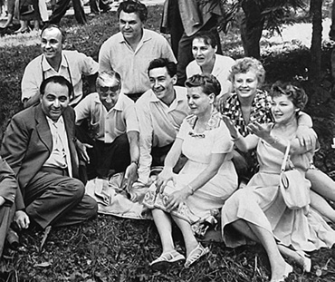 | Министр культуры СССР Екатерина Фурцева (третья справа), Николай Рыбников, Сергей Бондарчук, Вячеслав Тихонов, Нонна Мордюкова, Алла Ларионова, Ирина Скобцева и другие на загородном пикнике, конец 60-х |