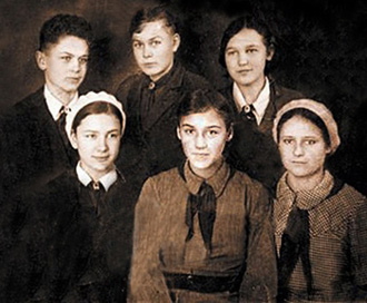 | Нонна (Ноябрина) Мордюкова (в первом ряду в центре) с одноклассниками, 1940 год |