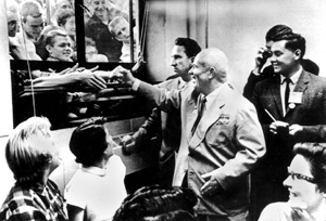 ![]() Никита Сергеевич в центре внимания во время остановки поезда в Санта-Барбаре. Штат Калифорния, начало 60-х |