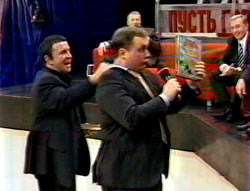 Сексолог вообще вел себя, мягко говоря, по-хамски. Столь эпатажному поведению мог позавидовать и сидевший рядом Владимир Вольфович Жириновский. Князькин в буквальном смысле вопил, что с удовольствием бы плюнул Кашпировскому в лицо. На что Анатолий Михайлович невозмутимо ответил: "Я бы хотел, чтобы наша встреча проходила на определенном интеллектуальном уровне. Если кто-то позволяет оскорбления, я могу проявить мужской характер, подойти и дать по роже".