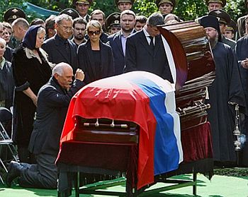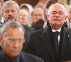 ![]() Во время траурной церемонии Никита Михалков то падал на колени, осеняя себя крестным знамением, то рыдал. На переднем плане — старший сын Сергея Владимировича Андрон Кончаловский |