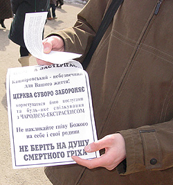 Не могу не сказать и о себе, которого за спасение миллионов людей стал преследовать религиозный террор со стороны православной церкви, которая вот уже 16 лет неутомимо вешает на меня ярлыки сатаны и убийцы, чернит злостной клеветой и наветами. Не в силах заполучить меня живьем в свои подвалы для пыток, православные террористы, не скрывая своих намерений предать меня мучениям, выкалывали мне глаза на больших плакатах в ряде городов демократической Украины, демонстрируя "верность" Христовым заповедям: "не убий" и "возлюби ближнего".