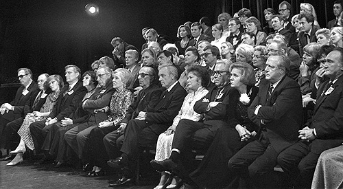 | Корифеи и восходящие звезды Ленинградского Большого драматического театра: Николай Трофимов, Алиса Фрейндлих, Олег Басилашвили, Евгений Лебедев, Кирилл Лавров, Зинаида Шарко, Светлана Крючкова, Юрий Стоянов и другие. Второй справа в первом ряду — Владислав Стржельчик, седьмой — художественный руководитель БДТ Георгий Товстоногов, четвертая справа во втором ряду — Людмила Шувалова, 1985 год. «При Товстоногове труппа условно была разделена на две части — любимцев, которые играли все, и остальных, которые были на подхвате» |