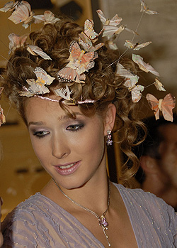 Телеведущей Кате Осадчей досталось куда меньше внимания, несмотря на сногсшибательный наряд. Катя расхаживала в нежно-сиреневом платье на голое тело, с высоченной прической, в которую были вплетены веточки с мотыльками.