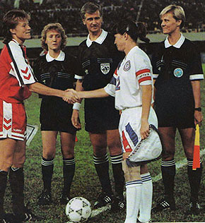 | Судьи Гертруд Регус, Вадим Жук и Ингрид Юнссон с капитанами сборных Норвегии и США в финале первого чемпионата мира по футболу среди женщин. Гуанчжоу, 1991 год |