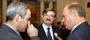 | Со своим бывшим работодателем — медиамагнатом, а ныне гражданином Испании Владимиром Гусинским. В свое время именно нежелание Гусинского согласовывать информационную политику НТВ с Кремлем положило начало путинской войне с олигархией |
