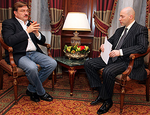 | Евгений Киселев — Дмитрию Гордону: «Получай удовольствие от каждого сладкого момента этой жизни, потому что никто не знает, когда колесо фортуны в мгновенье ока обратит тебя в прах» Фото Александра ЛАЗАРЕНКО |