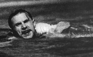 | Чапаев-Бабочкин тонет в реке Урал. Опасаясь слишком пессимистичного финала, Васильевы сняли еще два варианта концовки, в одном из них за кадром Чапаев обращался к уже поженившимся Анке с Петькой: «Война кончится, великолепная бу дет жизнь. Знаешь, какая жизнь будет? Помирать не надо!» |