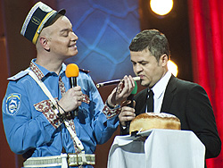 Но всех порвал Евгений Кошевой с номером «Гаишник». «Квартальные» представили, как будут общаться с водителями дорожные инспекторы, обязанные говорить только вежливо и только по-украински, но когда Женя выскочил к нарушителю под казацкий марш, можно было ничего не говорить. В одной руке у «инспектора» был каравай на рушнике, в другой - гетманская булава, полосатая, раскрашенная под жезл.