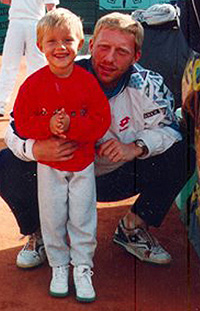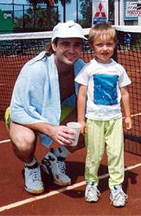 | Саша с украинским теннисистом Андреем Медведевым. Будучи тренером Медведева, Александр Долгополов-старший брал сына на все теннисные турниры, «чтобы он смотрел, как играют профессионалы» |
