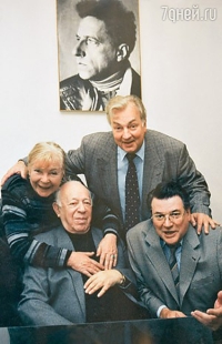 | Художественный руководитель Московского театра сатиры Валентин Плучек с Ольгой Аросевой, Михаилом Державиным и Александром Ширвиндтом на фоне Всеволода Мейерхольда |