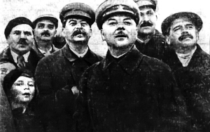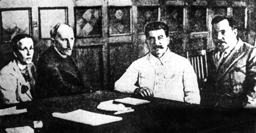 | Французский писатель Ромен Роллан с женой, Иосиф Сталин и Александр Аросев, 1935 год. «Роллан был тусклый сгорбленный старик, больной туберкулезом. Глаза, правда, очень живые...» |