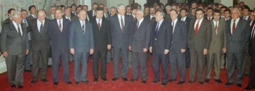 | Совещание глав государств-членов СНГ в Минске 30 декабря 1991 года. Президент Таджикистана Рахмон Набиев, председатель Верховного Совета Беларуси Станислав Шушкевич, президент Узбекистана Ислам Каримов, президент Азербайджана Аяз Муталибов, президент России Борис Ельцин, президент Украины Леонид Кравчук, президент Казахстана Нурсултан Назарбаев, Государственный секретарь РСФСР Геннадий Бурбулис, президент Армении Левон Тер-Петросян, президент Молдовы Мирча Снегур и другие |
