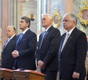 | Станислав Шушкевич, Президент Украины Виктор Ющенко, президент Литвы Валдас Адамкус и президент Польши Лех Качиньский, Варшава, 2009 год. «Виктору Андреевичу, думаю, просто не повезло, и достойнейшим человеком его считаю» |