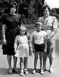 ![]() Слева направо: тетя Валя с пятилетней Олечкой и мама Галя с братом Толиком, 1991 год |