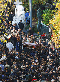Дорогу, по которой двигался траурный кортеж, усыпали лепестками роз. Перед гробом (стоимостью около 100 тысяч долларов) молчаливые люди в черном несли десятки огромных букетов, многочисленные портреты усопшего и развернутый полутораметровый российский флаг.