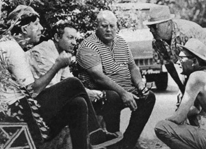 | Юрий Никулин, Георгий Вицин и Евгений Моргунов на съемках «Кавказской пленницы», справа сидит — режиссер Леонид Гайдай, 1966 год |