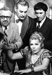 | Пан Профессор (Борис Рунге), пан Беспальчик (Владимир Козел), пан Директор (Спартак Мишулин) и пани Моника (Ольга Аросева) в «Кабачке «13 стульев». «Спартак замечательно работал, и этот образ принес ему невероятную славу» |