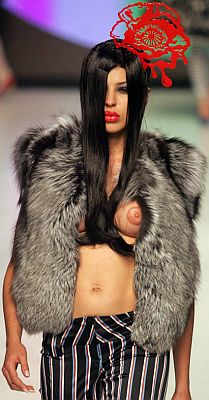«Там» на женщинах-моделях были импровизированные секс-шоповские садо-мазо-маски с крупной клубникой вместо кляпа, здесь - мужские корсеты от молодого дизайнера Александра Шкарупского. Или светлый верх и темный низ аки юбка до колен воспитанницы пансиона на актере Александре Вертинском (коллекция Елены Ивановой «Скромнее, сестра!»). Или черный кринолин в оборках на парне с голым торсом и волосами ниже талии от Алексея Залевского.