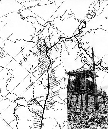 Через пять километров мы добрались до нескольких недостроенных деревянных бараков, обтянутых как попало в два ряда колючей проволокой, и с двумя вышками (их еще называли «попки»), торчавшими по углам. Этот лагерь именовался одиннадцатым. Следующий был двенадцатым, почти на таком же расстоянии находился тринадцатый... По слухам, их количество доходило до 20-ти. Все это был один строительный железнодорожный комплекс, растянувшийся на 28 километров.